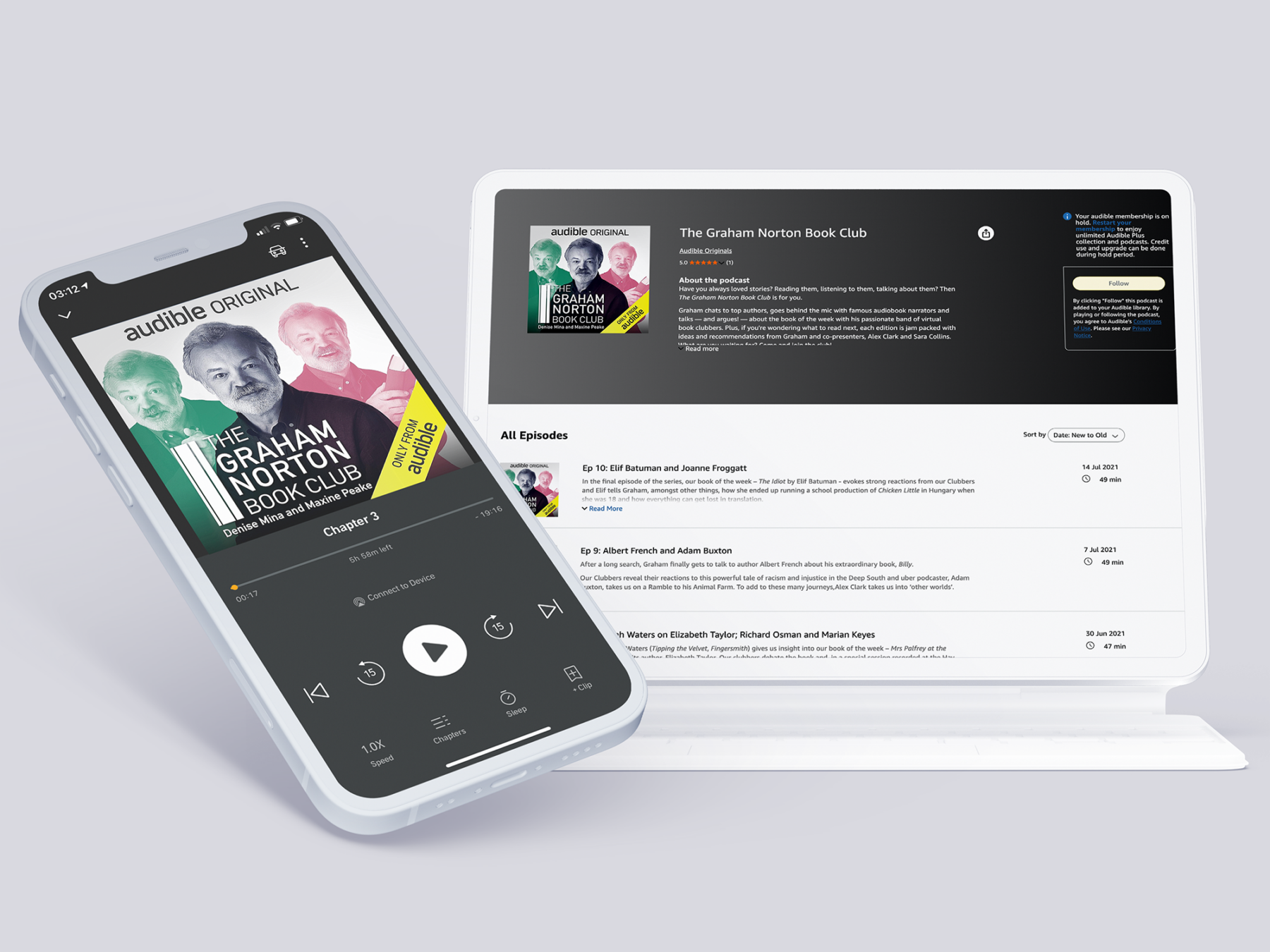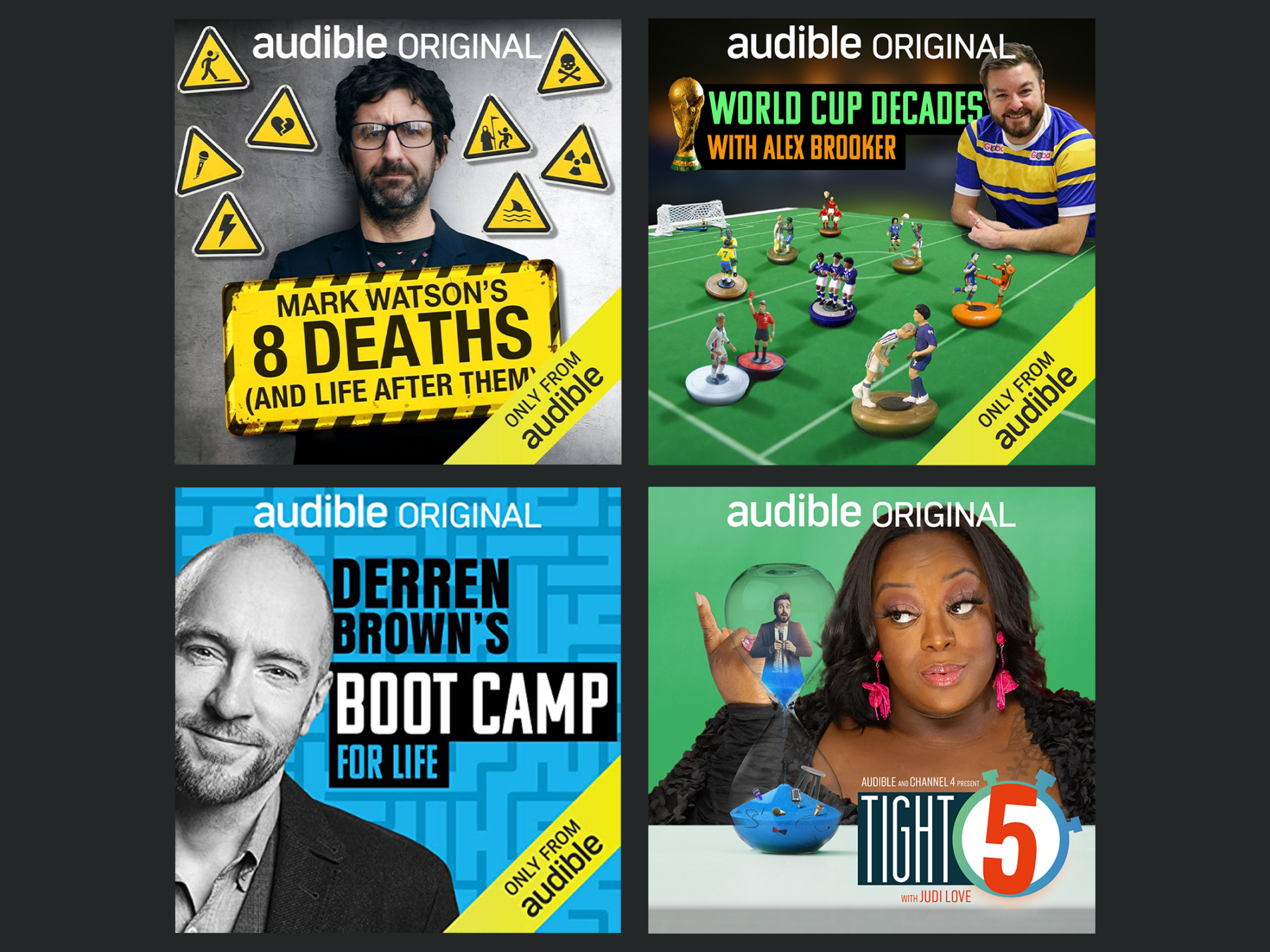 Designing for Audible presents a specific creative challenge: translating the spoken word into something visual. The work spans both ends of the content spectrum, from titles where the writing itself is the draw and the design must communicate tone, genre and mood with economy, to podcasts and personality-led content where the performer is the brand and recognition does the heavy lifting. Each requires a different creative instinct, and knowing which approach serves the content is half the job..